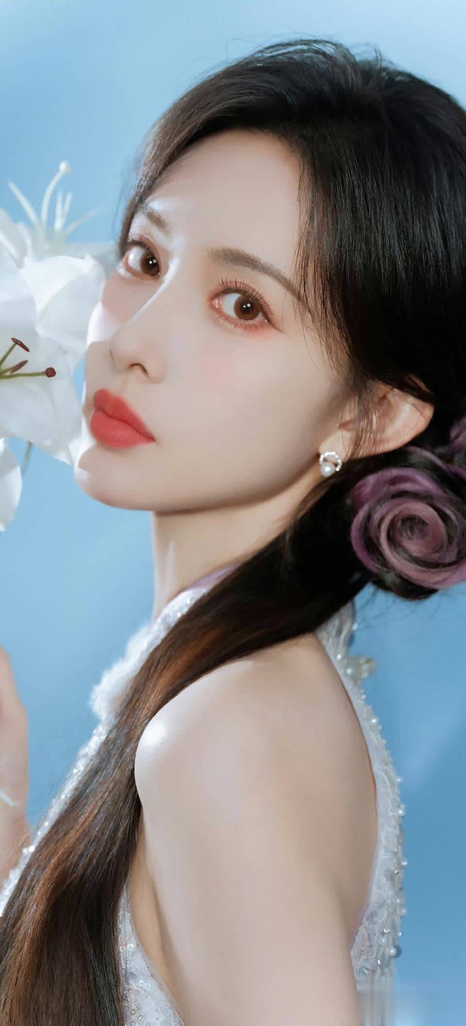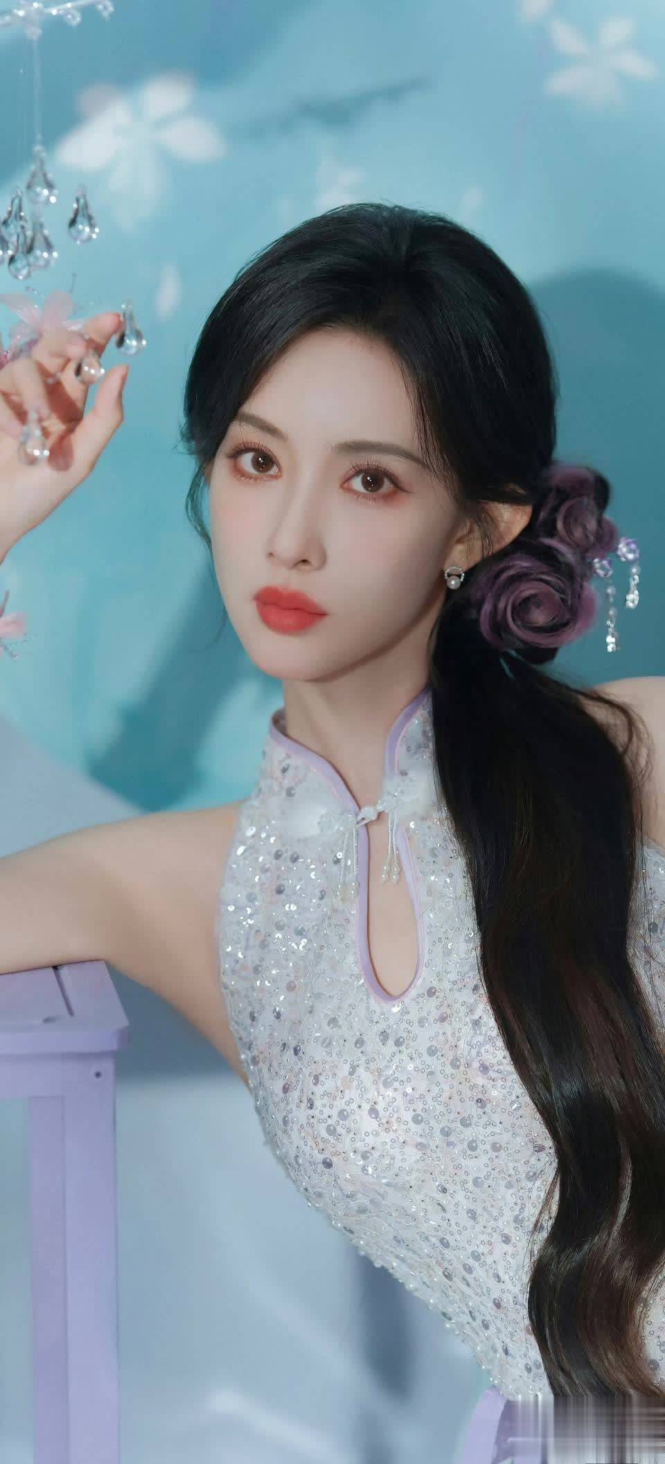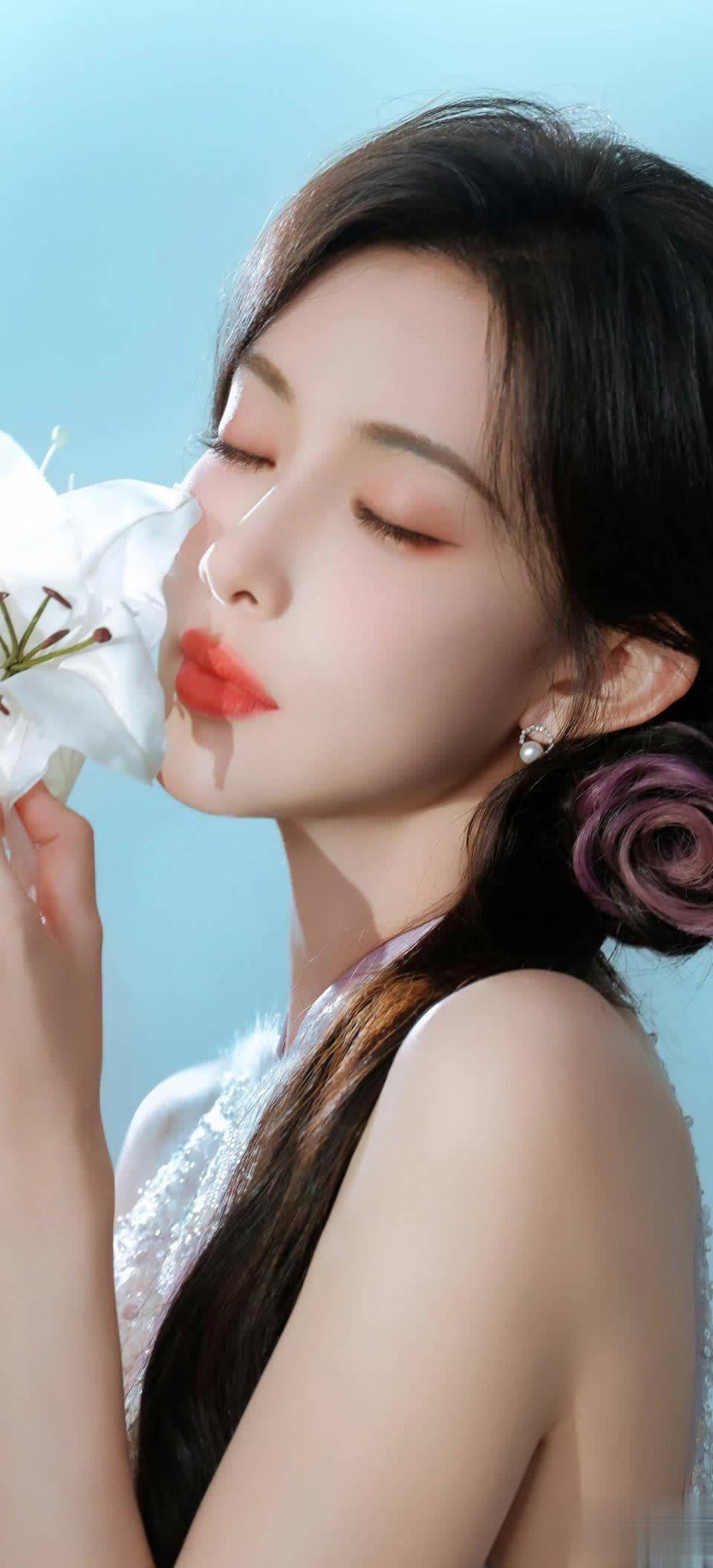 孟子义将乌黑长发编入紫色花朵发辫,手持白百合轻贴脸颊。珍珠耳钉点缀在耳畔,与露肩礼服的闪光面料形成巧妙呼应。这种“繁简结合”的穿搭哲学正是她时尚品味的缩影——曾在采访中透露“配饰不超过三件”的她,总能用细节营造高级感。