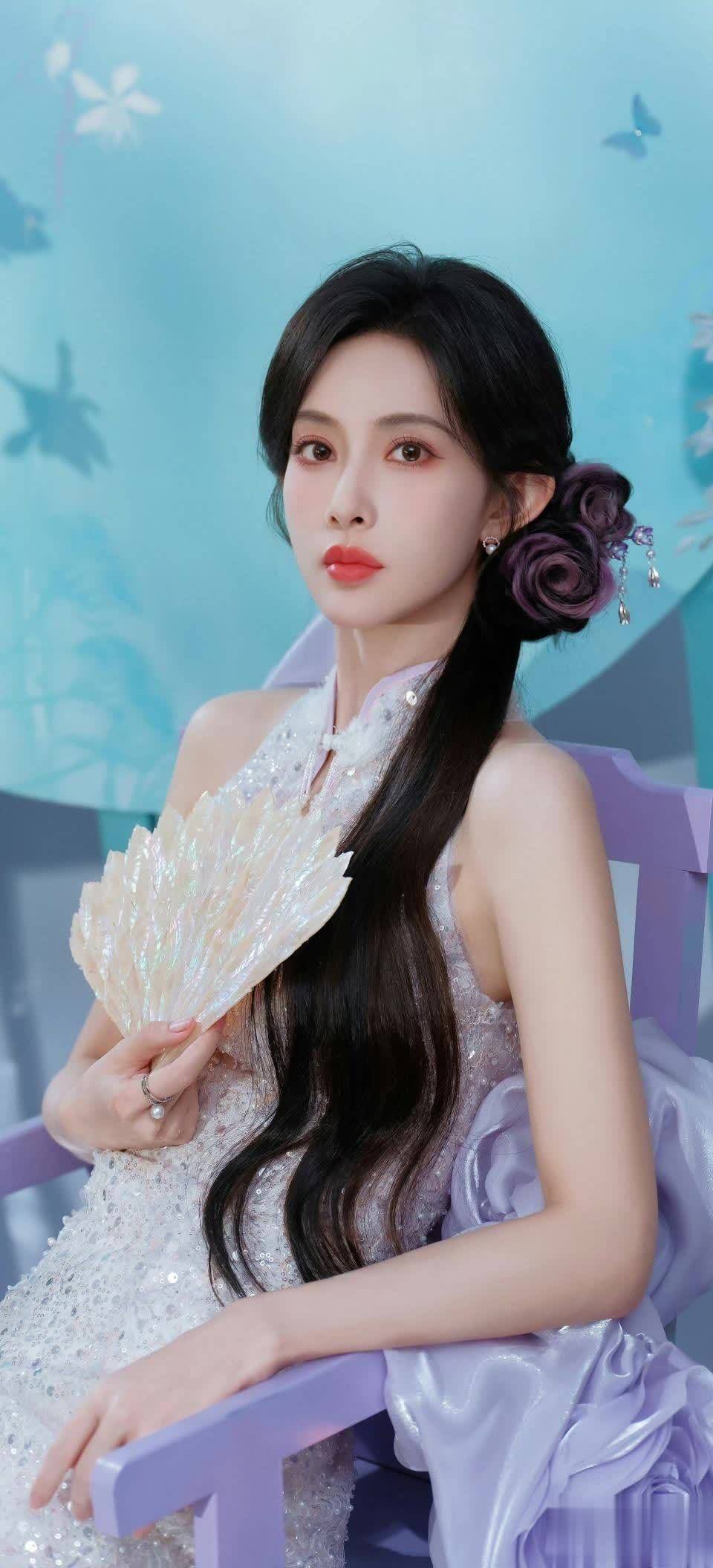 坐在紫椅上的她,手握珍珠贝扇的姿态慵懒却不失气场。礼服立领设计透露着她的穿搭巧思:私服钟爱新中式的她,常将盘扣元素混搭现代单品。正如她曾在社交媒体分享的:“传统不是束缚,是藏在骨子里的审美基因。”
